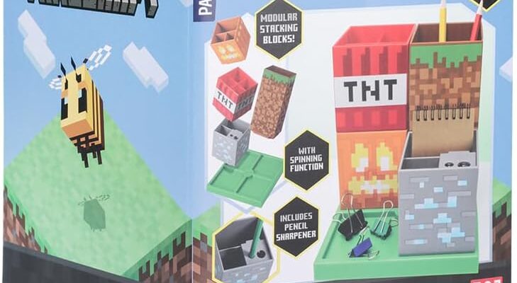 Create Your Own Stationery Holder: Unleash your inner gamer and architect with this Minecraft Desktop Organizer. Customize your pen pot or pencil sharpener holder using modular stacking blocks like diamond ore and TNT.